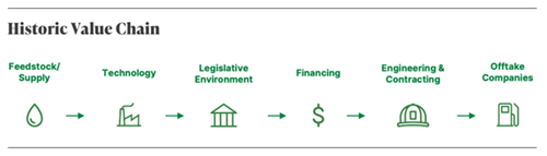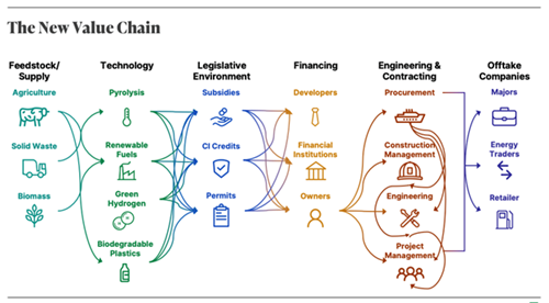 The new value chain is comprised of stakeholders that historically did not work together. Instead of crude oil, feedstocks are sourced from nature, agriculture and waste management companies. Each of these processes requires novel and adapted technologies offered by different vendors with competing guarantees. Early economic incentives exist, but the legislative environment fluctuates. Developers with little experience in major complex projects must now navigate financing challenges, conflicting EPC approaches and entrenched product retailers.