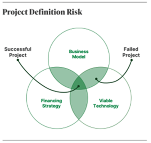 Projects in the new value chain must optimize three inputs in project definition: business model, financing strategy and viable technology (FIG. 3). Aligning only two of these inputs will not result in a successful project.