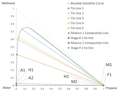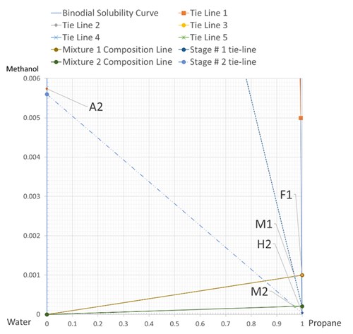 While it is theoretically possible to develop a liquid–liquid extraction equation of state and computational model, most commercial packages available are of limited utility for polar interactions such as those found with water and methanol.4 Instead, here, a ternary diagram for the propane-water-methanol system or butane-water-methanol system was recreated with extrapolated tie lines for the areas of interest in water extractions (typically < 3 wt% water and < 1,000 ppmw methanol) using original data from an earlier study.5