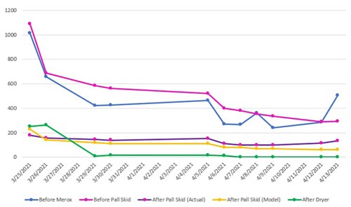 FIG. 10. Methanol concentration in the propane at various locations in the RFS1 train using high-efficiency liquid-liquid coalescersb.