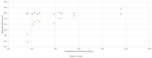 A plot of the actual and modeled separation efficiency of the high-efficiency coalescer unit is presented in FIG. 11, based on the feed methanol concentrations.