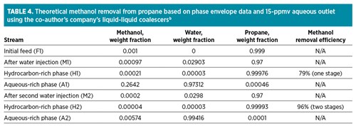Based on available ternary equilibria data, a method for predicting how much methanol can be extracted from butane or propane for a given water injection has been described here with the use of high-efficiency liquid–liquid coalescers. The predicted methanol reductions were compared to plant data and found to be within 15% of these values.