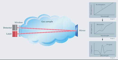 FIG. 1. TDLAS employs a laser beam, tuned over a spectrum of light wavelengths that are absorbed by different components in a gas sample. These components can be identified and quantified depending on the measurement at the detector.
