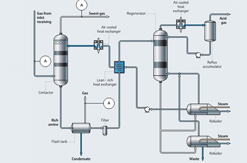 Amine treatment (FIG. 4) is a common methodology for removing H2S, and it requires continuous monitoring of both the sour gas inlet and the sweet gas outlet to optimize process efficiency and ensure effective treatment. Fractionation is also frequently used to boil off impurities, and accurate measurement at each stage provides necessary feedback to the process control system.