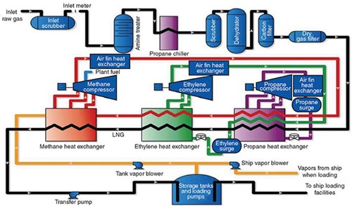 The OCP process can be broken down to four principal areas: inlet receiving, gas treatment, liquefaction and LNG storage/loading. Liquefaction is performed in three stages of pure refrigerant cascade. The first cooldown of feed gas is via propane refrigeration, followed by ethylene and final cooldown by methane refrigeration. The propane circuit also cools down the ethylene and methane streams, while the ethylene circuit cools down the methane stream as well as the feed gas. The process is highly heat integrated, hence its extremely high thermal efficiency. Boiled off-gas (BOG) from the LNG tanks is returned to the trains to be recompressed by the methane compressor.