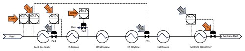 FIG. 2 shows the simplified process flow diagram outlining the train feed pressure and flow variables. Pressure control PC-2 is designed to maintain stable feed gas pressure to the train. Flow control FC-1 utilizes flow measurement from the metering package upstream of feed gas heater, and a flow control valve located downstream of the high-stage ethylene feed chiller. Accurate train feed flow is a fundamental control requirement on an OCP LNG train: during changing ambient conditions or transient temperature swings (which can occur when hot effluent air is blown into the turbine intakes on the adjacent train), the train flowrates must be quickly reduced to avoid an excursion outside the desired plant operating envelope.
