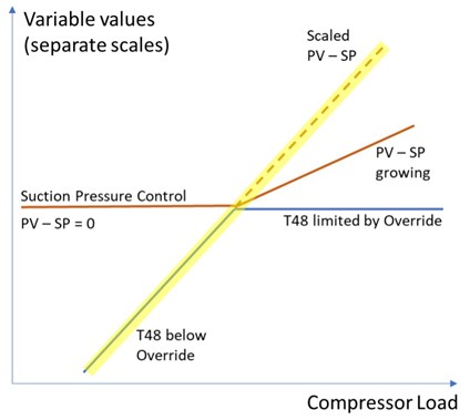 During higher ambient or production conditions, a turbine override will become active—this is generally the turbine combustion temperature (also known as the T48 temperature). Note: Each refrigerant turbine will have a unique T48 temperature, and it is only when both turbines in a service are T48 limited that the master suction pressure is genuinely off-control. At this point, each turbine T48 temperature remains clamped at the override setpoint programmed in the turbine control system. This process discontinuity is a challenge for linear MPC applications, as the variable is no longer continuous (i.e., there is no measure of the T48 ‘error’ or deviation above the turbine capacity constraint and the process relationship between the suction pressure MV and respective process-related CVs are no longer present).