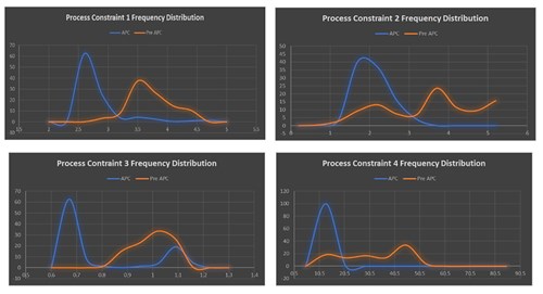 FIG. 4. Pre- and post-process histograms data showing significant reduction in process variance, and the shift in operating point towards the envelope limit.