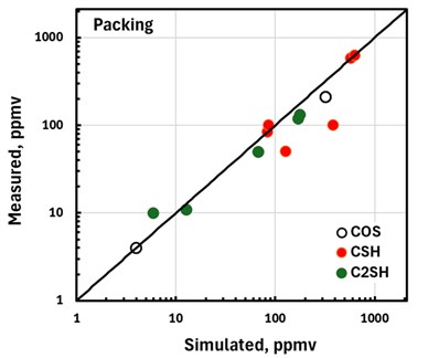 The simplest way to compare simulation with plant measurements is on a parity basis. FIGS. 3 and 4 compare measured and simulated mercaptans and COS levels in the treated liquid from trayed and packed columns, respectively.