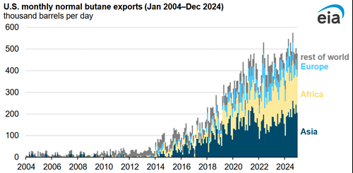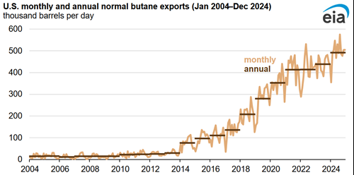 The U.S. is exporting record volumes of normal butane as global demand for liquefied petroleum gases (LPG) surges. U.S. normal butane exports averaged nearly 500,000 bpd in 2024, a 12% increase from the previous year, and have increased every year since 2006.