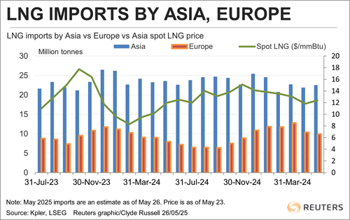 Asia's imports of liquefied natural gas (LNG) stagnated in May while Europe's continued to ease as demand in both of the world's top-importing regions entered the seasonal slump between winter and summer peaks.