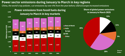 The world's largest power polluter, China, made its biggest cut to power emissions since 2020 so far this year, but global power emissions have still held largely flat due to higher fossil fuel power generation in the United States and Europe.