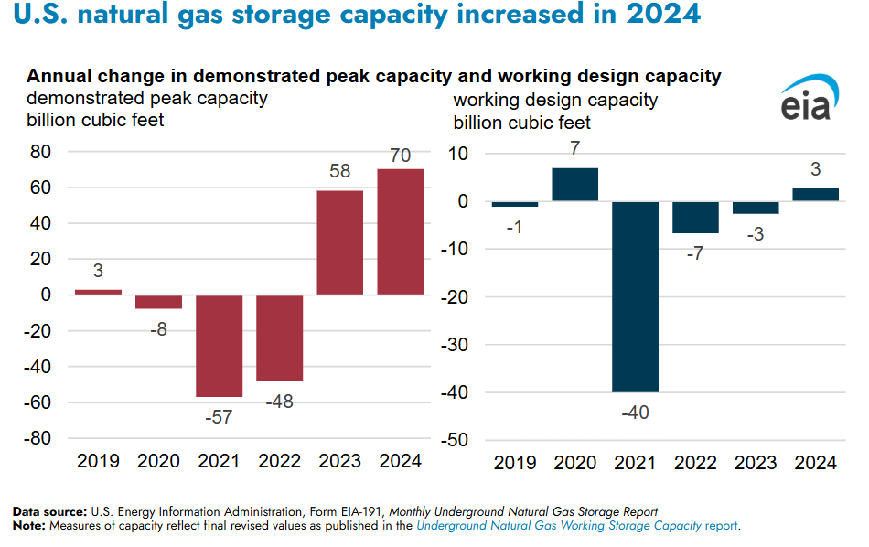 Underground working natural gas storage capacity in the Lower 48 states increased in 2024, according to the latest data from the U.S. Energy Information Administration (EIA).