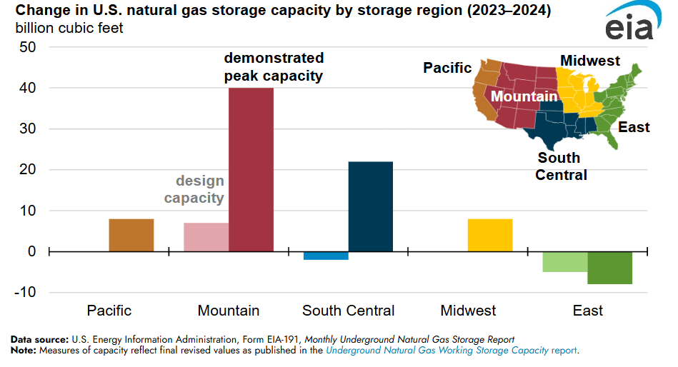 In 2024, demonstrated peak capacity increased in four of the five storage regions of the Lower 48 states. The increased demonstrated peak capacity reflected both greater utilization of existing facilities and expansions of existing infrastructure.