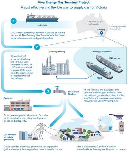 The gas terminal will be an important component of the Viva Energy Hub, which incorporates the Geelong refinery, strategic fuel storage, a green hydrogen refueling station, plans for co-processing low-carbon liquid fuels and participation in the circular economy through the recycling of waste plastic and tires.