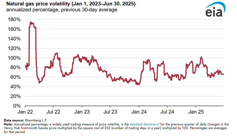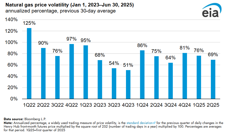 Since 2022, natural gas markets have experienced a series of extremes, including both unusually high and low inventory levels, which contributed to elevated price volatility. Recent quarters, by contrast, have seen more seasonally consistent price movements, suggesting that natural gas market dynamics have steadied amid record storage injections and more balanced inventories.