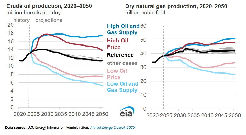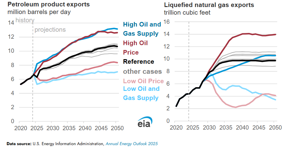 In its Annual Energy Outlook 2025 (AEO2025), the U.S. Energy Information Administration (EIA) projects that U.S. production growth of crude oil and natural gas will remain relatively high through 2030 due to increasing U.S. exports of petroleum products and liquefied natural gas (LNG), as U.S. energy exports continue to be economical for international consumers.