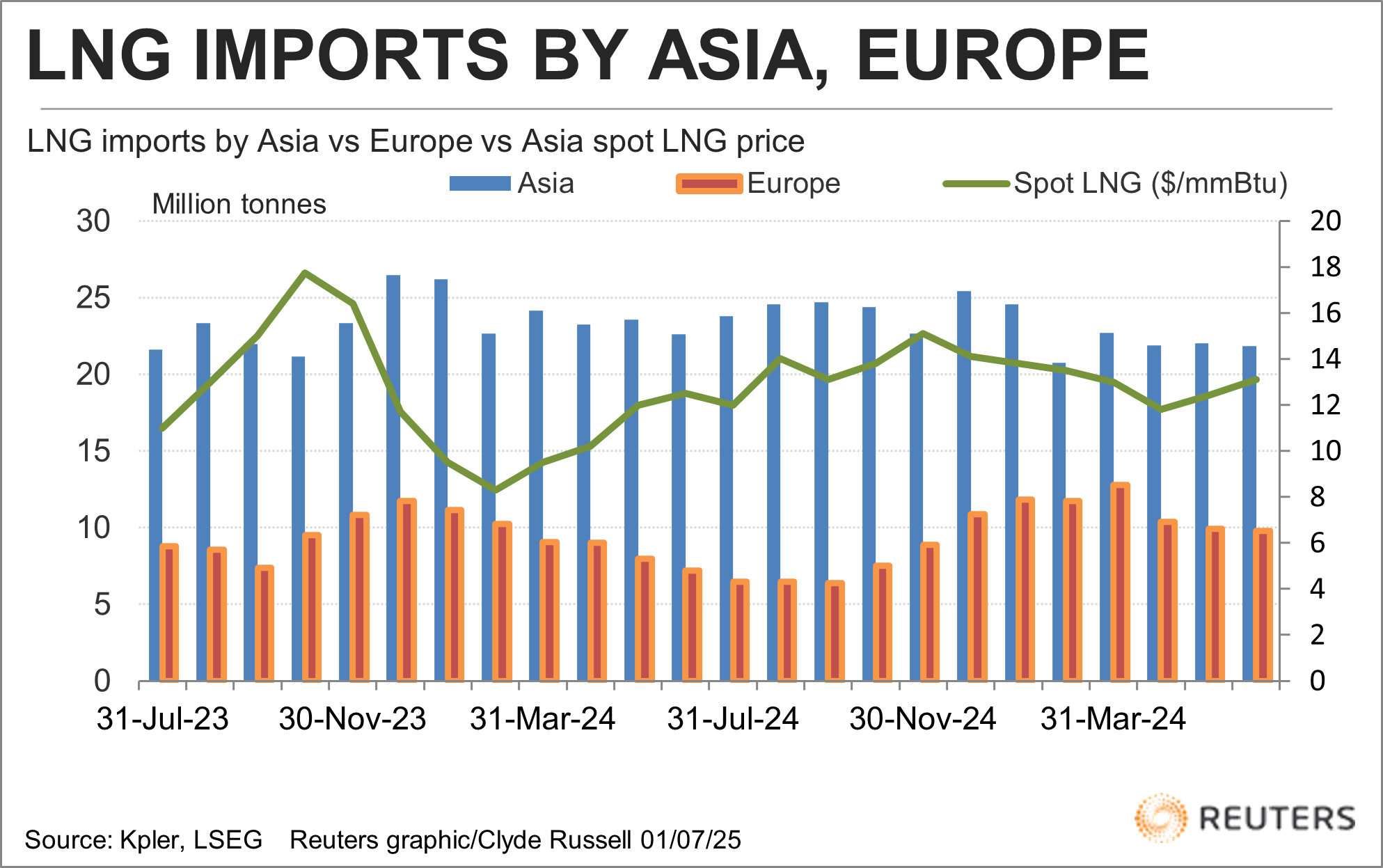 Global imports of liquefied natural gas (LNG) ticked higher in the first half of 2025 as stronger European demand pulled cargoes away from Asia.