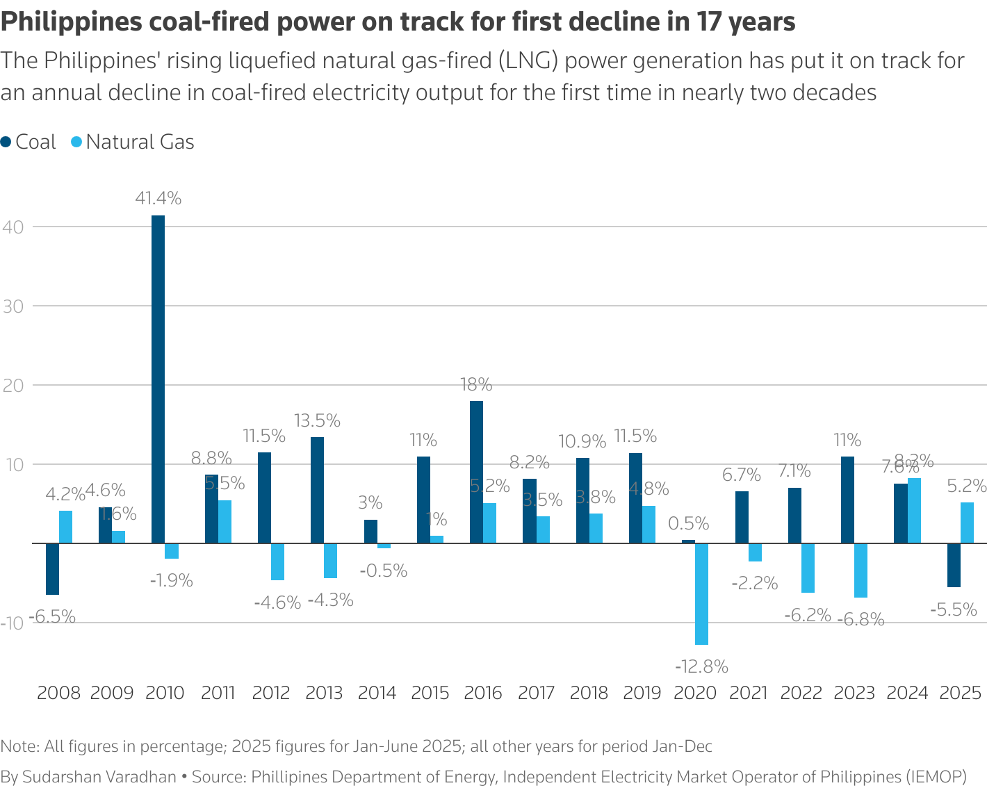 The Philippines is on track for an annual decline in coal-fired electricity output for the first time in nearly two decades, an analysis of market and government data showed, driven by rising liquefied natural gas (LNG)-fired power generation.