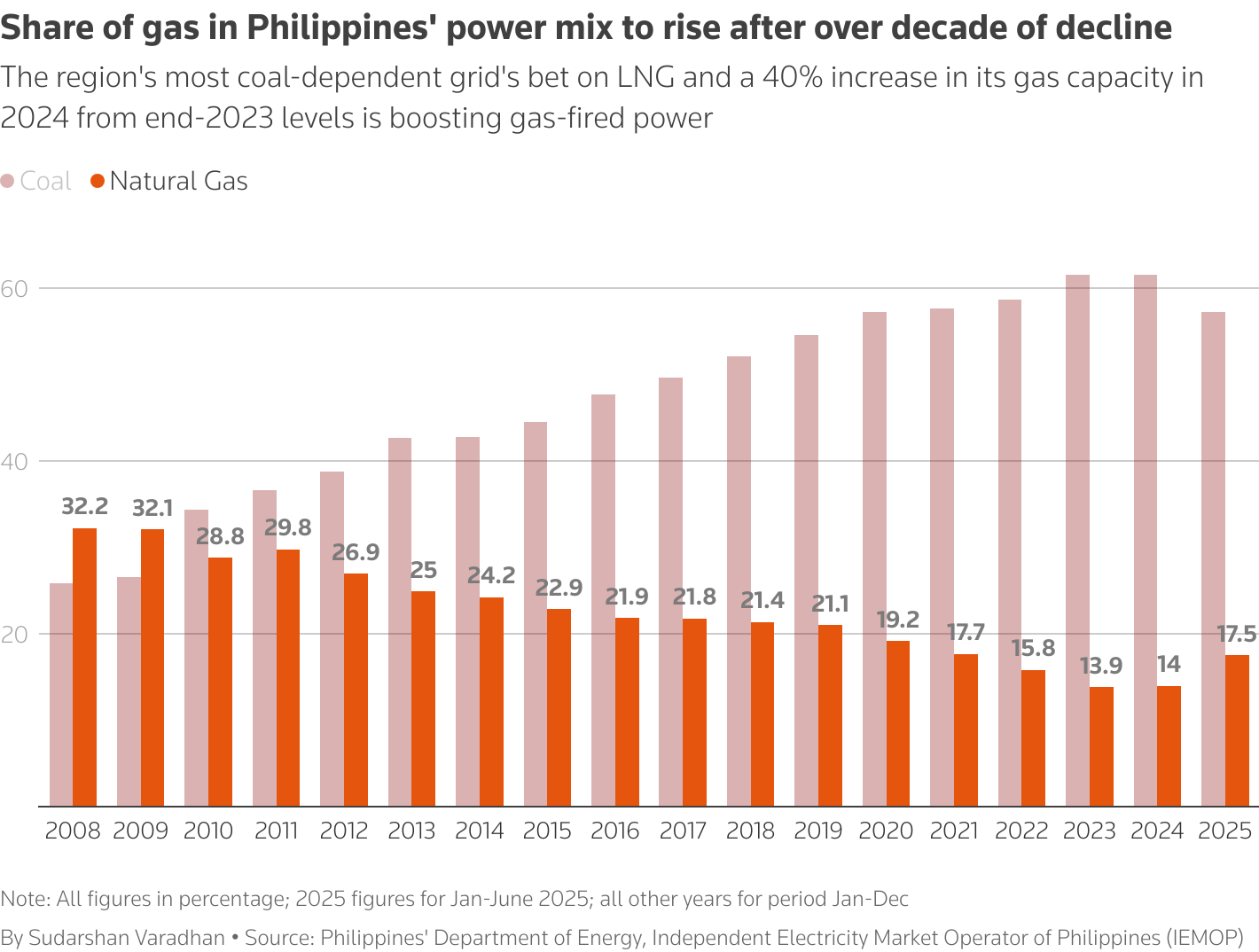That helped push the share of gas-fired power output to 17.5% in the first half of 2025, up from a record low of 13.9% in 2023, which was due to depleting reserves at the key Malampaya field, according to government data dating back to 2003.