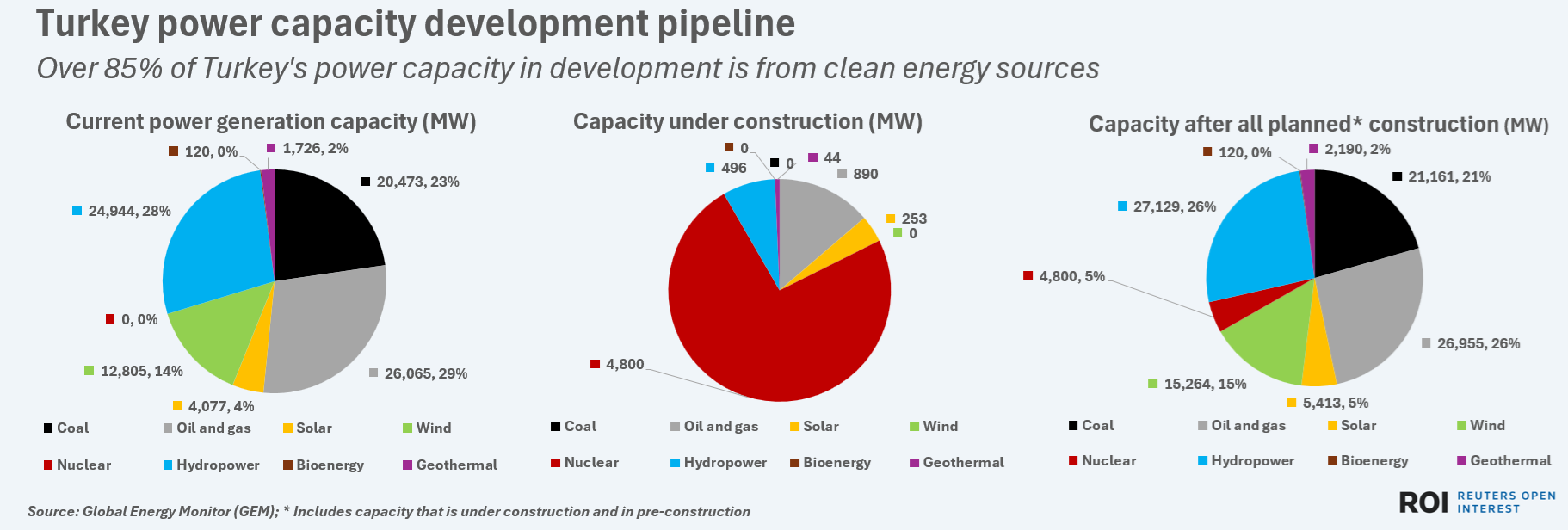 Surging solar capacity lifted Turkey's solar-powered electricity supplies above gas-fired electricity output for the first time last month, while the country's first ever nuclear plant is due to start production within months.