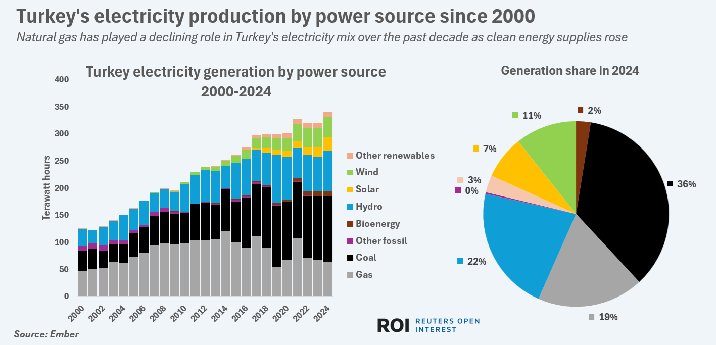 That steady supply of cheap coal, however, has resulted in reduced demand for pricier natural gas in Turkey, with gas-fired plants supplying only 19% of Turkey's electricity last year.