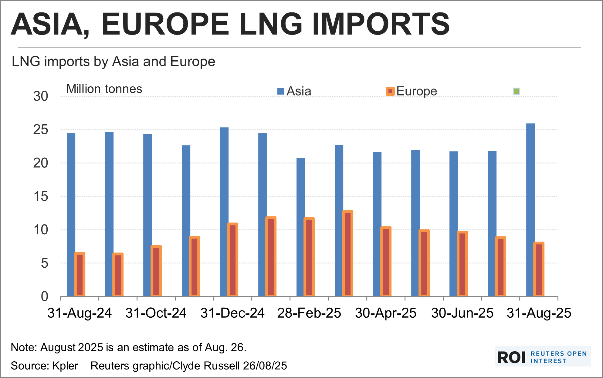 However, Europe's LNG imports are still up strongly on a year-on-year basis, with August likely to be 22% higher than the 6.45 million from the same month last year.