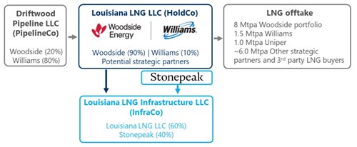 - Williams will hold 10% equity in Louisiana LNG LLC (HoldCo), with the remaining 90% of HoldCo currently owned by Woodside.