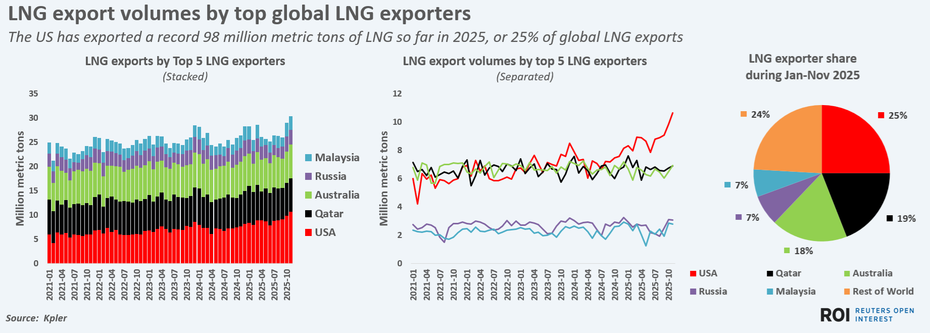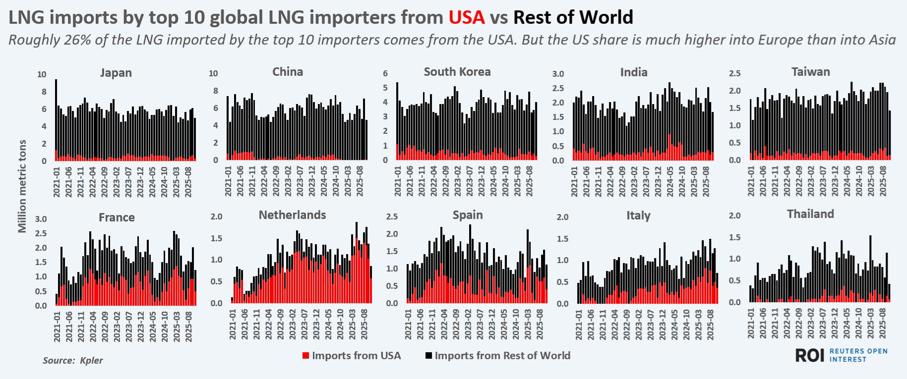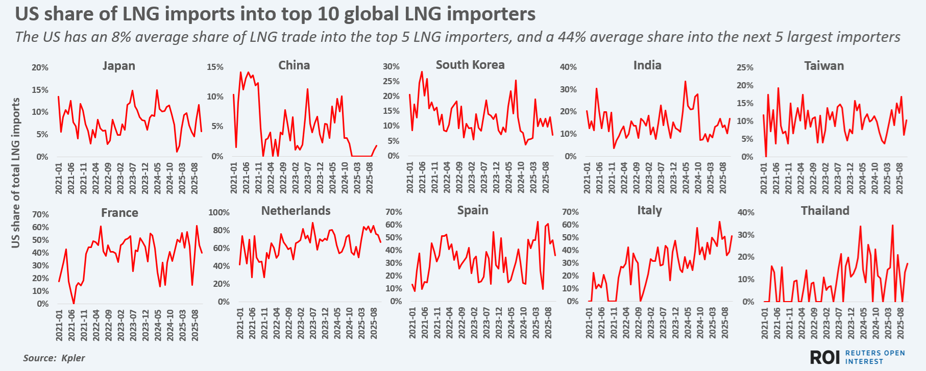 So far in 2025, the U.S. share of LNG exports to the top five global LNG importers - Japan, China, South Korea, India and Taiwan - is just 8%, as other exporters such as Qatar and Australia hold far higher Asian market shares.