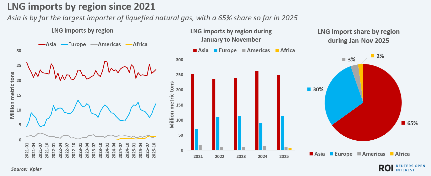 And although Europe's total LNG import volumes have jumped by 25% in 2025 from last year, Kpler data shows, Europe's total LNG import needs have expanded by only 2% since 2022 as the power sector retooled generation sources away from fossil fuels.