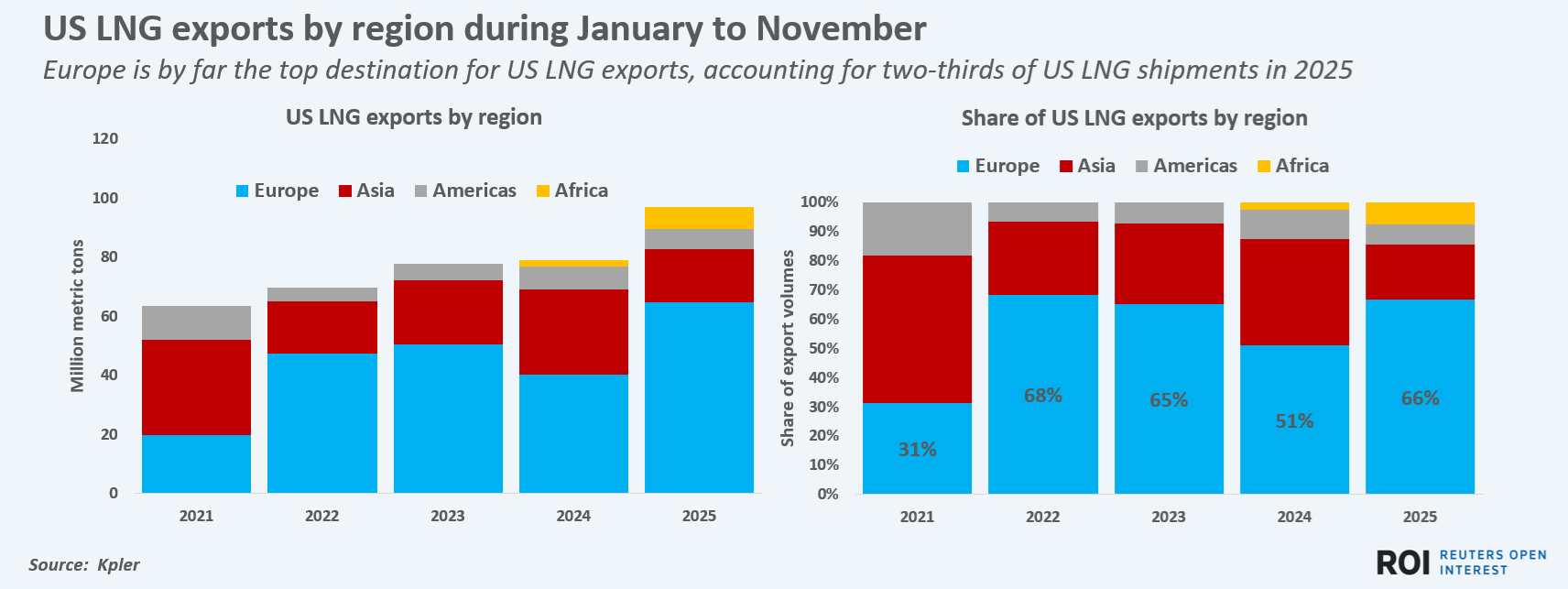 Euro centric. European nations have accounted for two-thirds of U.S. LNG exports this year, which is the highest concentration of U.S. export flows to a single continent since 2022, when Europe's demand for LNG spiked following Russia's invasion of Ukraine.