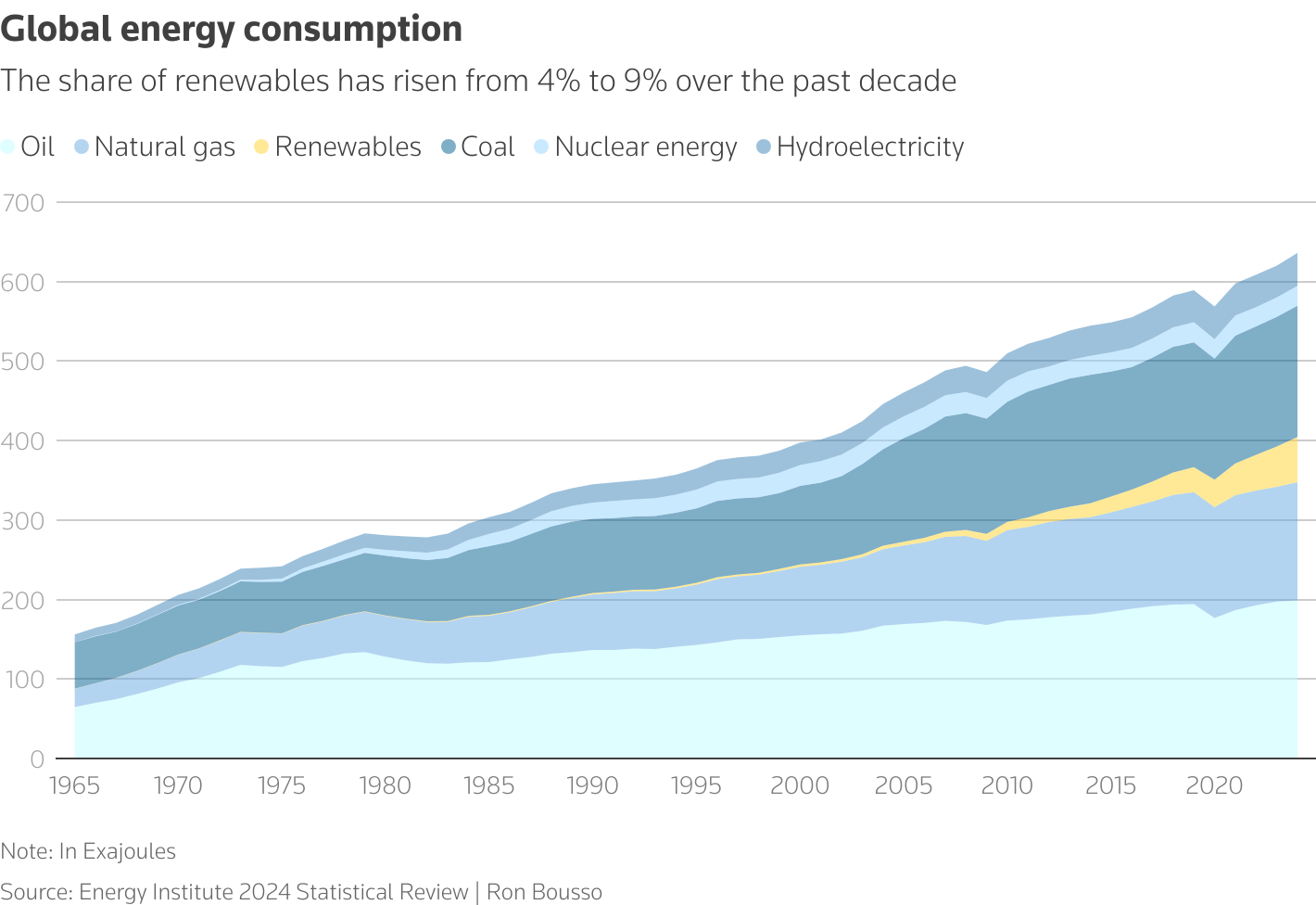 Ten years on, global renewables consumption has tripled, with solar alone growing more than seven-fold, according to the Energy Institute's 2024 Statistical Review. But the hard truth is that fossil fuel consumption has continued rising, with the share of wind and solar in the world's energy mix growing from 4% to 9% of the mix over the past decade.