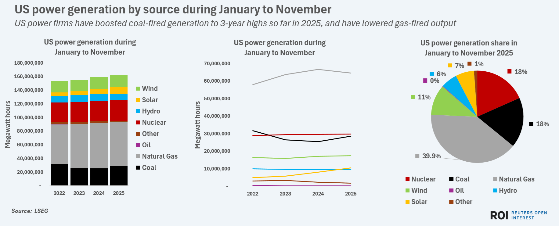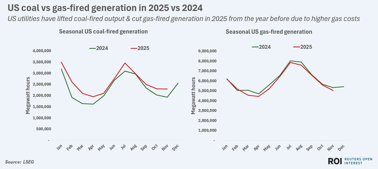 Utilities followed a similar playbook during the first quarter of 2025, when U.S. coal-fired output increased by 21% from the same period in 2024 while gas-fired power output dropped by around 3% from the year before, LSEG data shows.