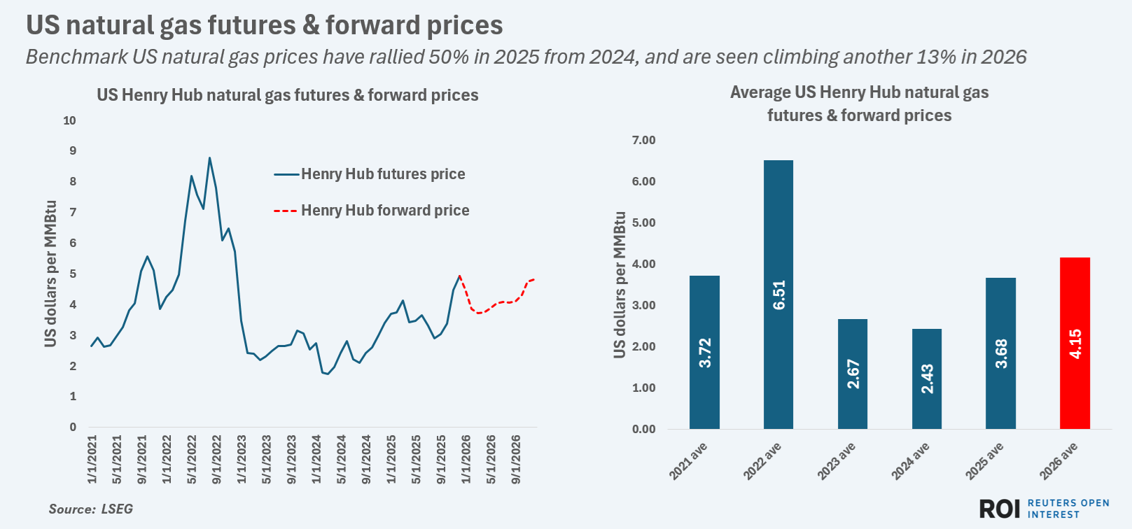 However, for the whole of 2026 Henry Hub futures are currently expected to average $4.15/MMBtu, which would be the highest average annual U.S. natural gas price since 2022 and would mark the third straight year of U.S. gas price increases.