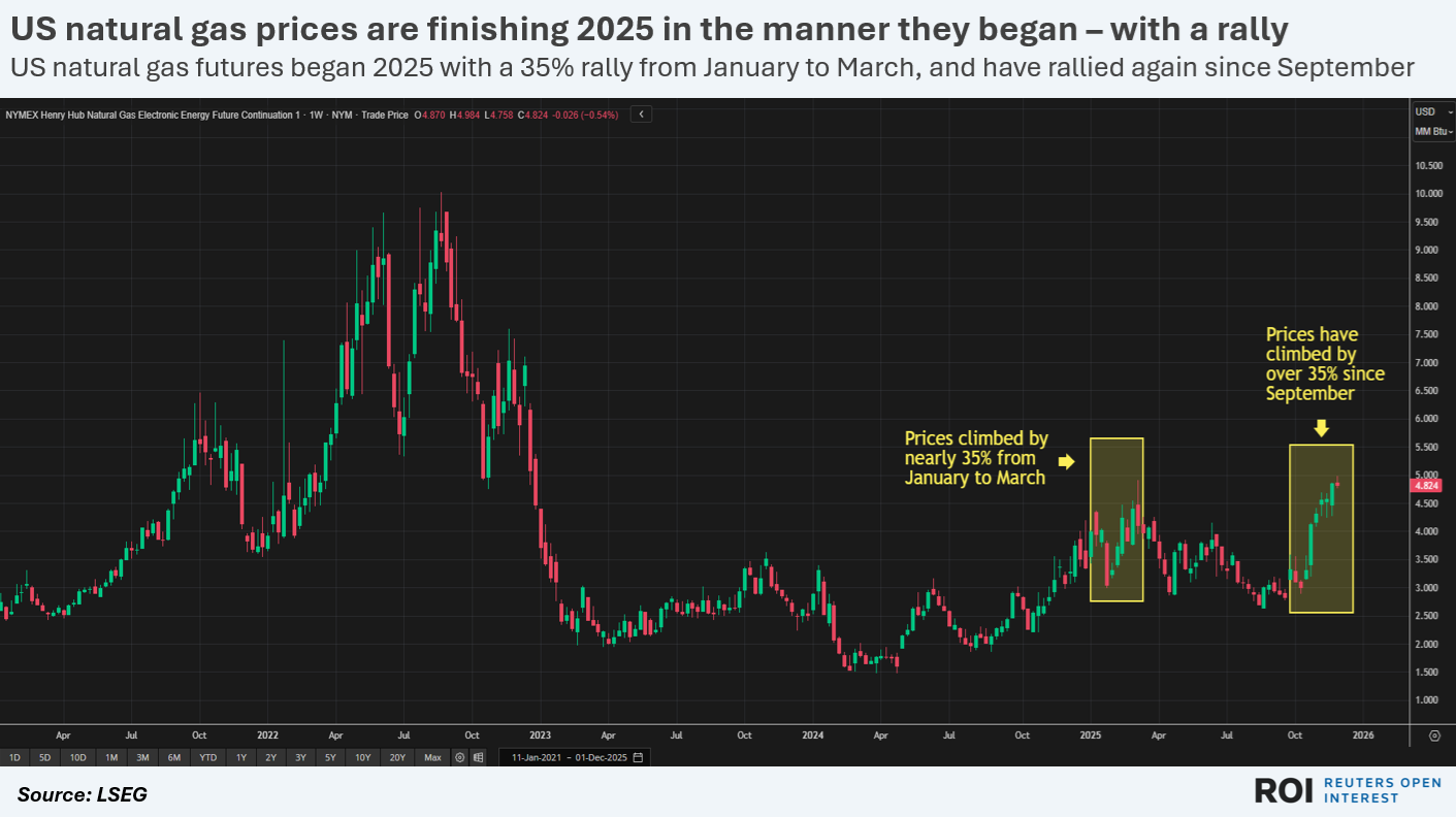 Benchmark U.S. natural gas prices are ending 2025 in the manner that they began - with a strong rally. And that's bad news for people hoping for further cuts to U.S. coal use.