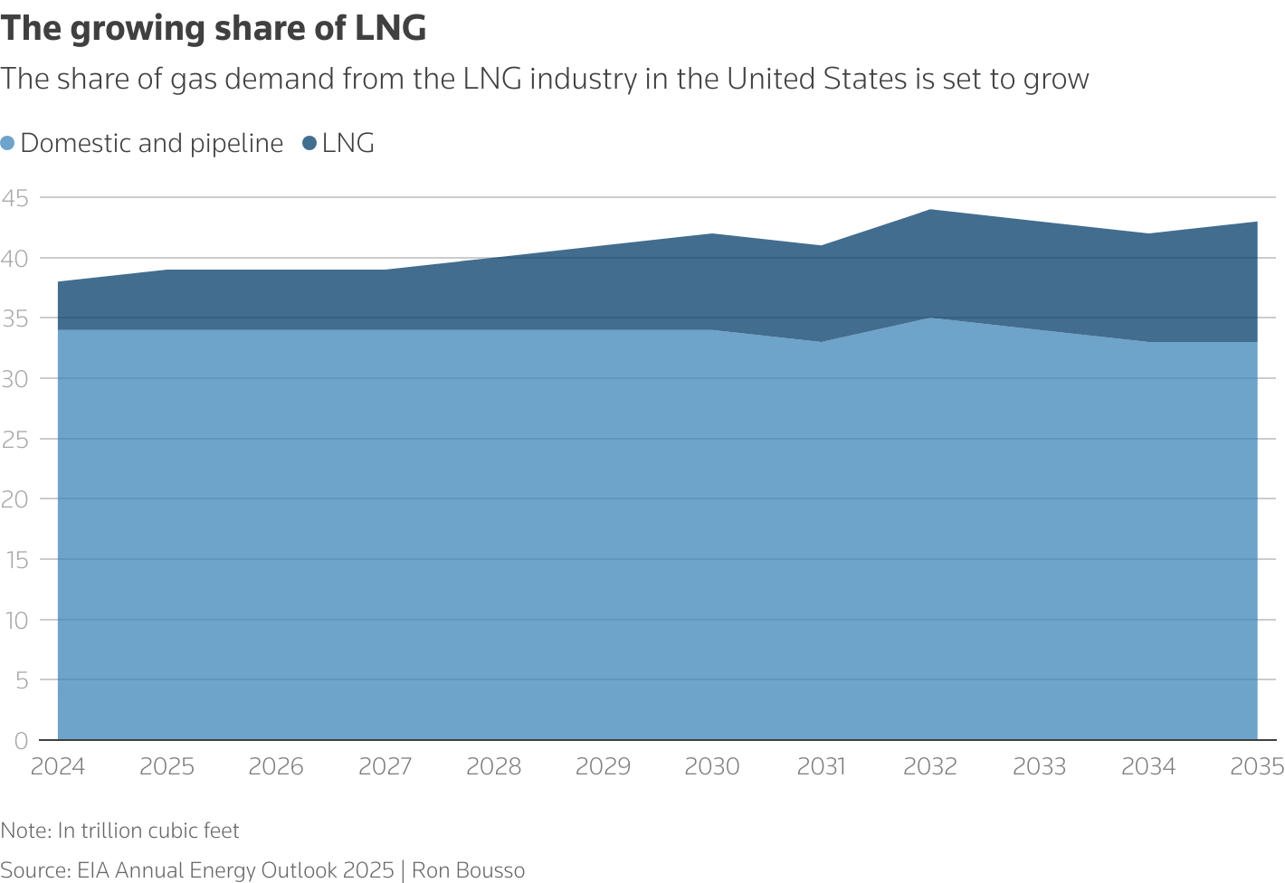 Increasing political risk. U.S. gas production is set to increase from around 39 tft3 in 2025 to 42 Tft3 in 2030, according to the Energy Information Administration. However, over the same period, the share of gas demand from LNG producers is set to rise from around 13% to 20%.