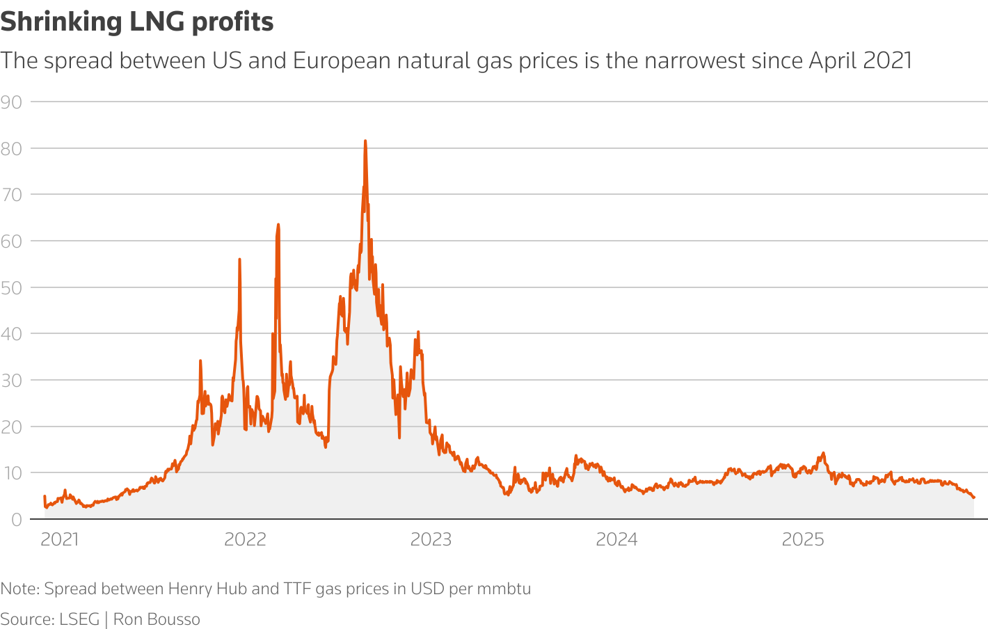 As a result of the dynamics on both sides of the Atlantic, the spread between Henry Hub and TTF prices has shrunk to around $4.70 per MMBtu, the slimmest since April 2021, according to LSEG data.