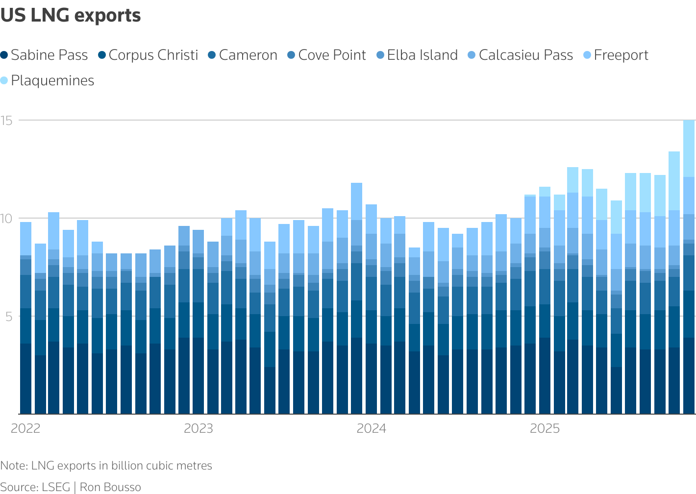The U.S. became the world's biggest LNG exporter in 2023, surpassing Australia and Qatar. Exports from its eight main LNG terminals hit a record 12 Bm3 in November, a 20% rise from a year earlier, according to LSEG data.