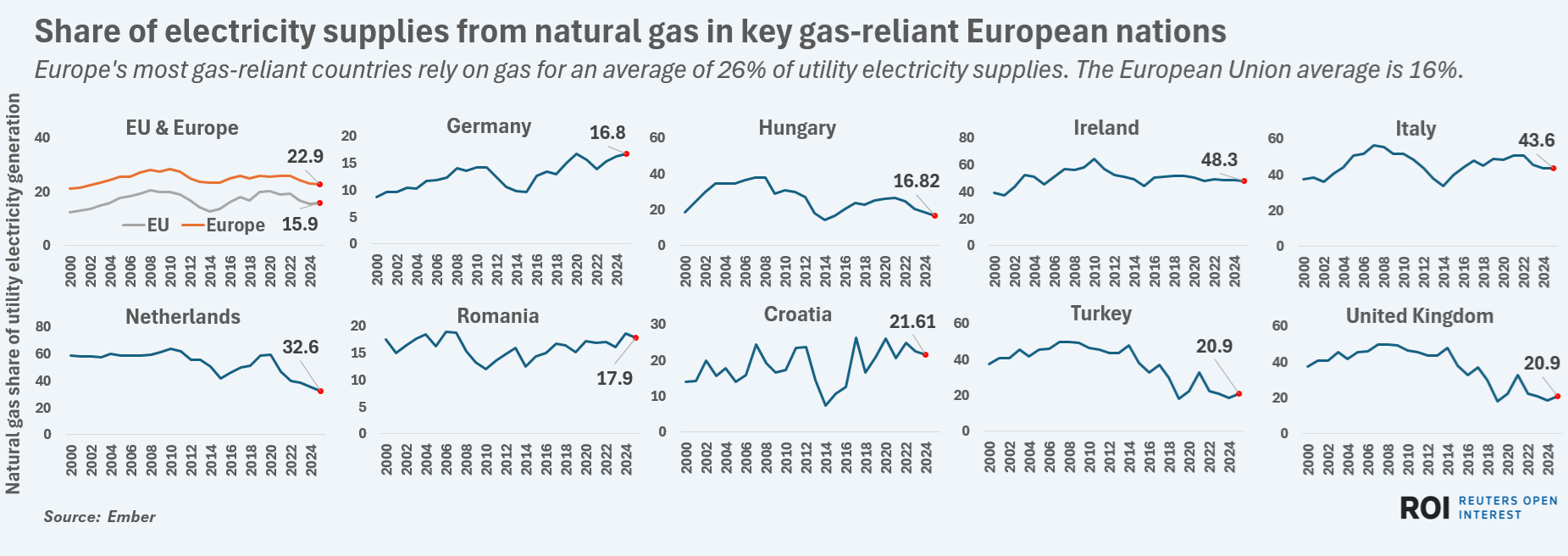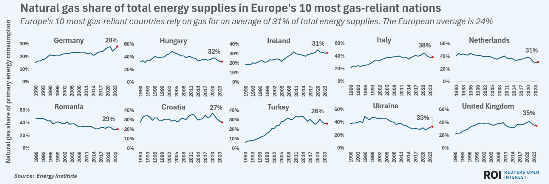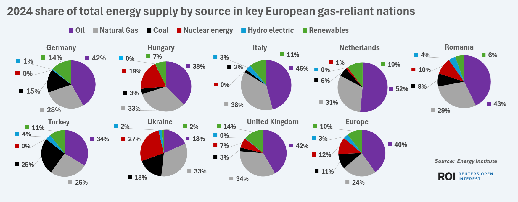 Italy is Europe's most gas-reliant economy, with 38% of its total energy supplies sourced from natural gas in 2024, according to data from the Energy Institute.