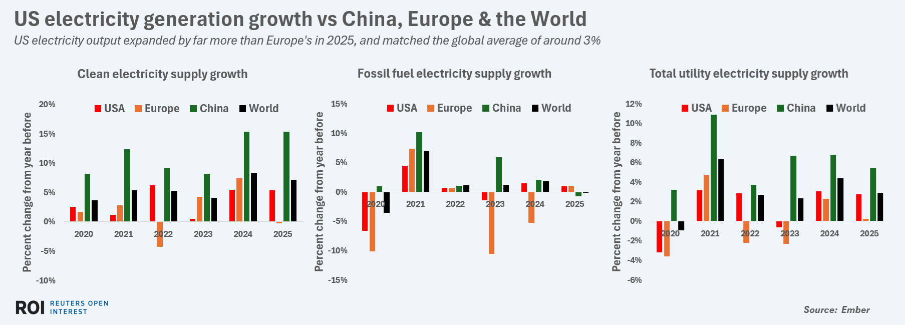 The U.S. growth rate matches the global average in 2025, but lags the 5% rise in utility electricity output posted by China.