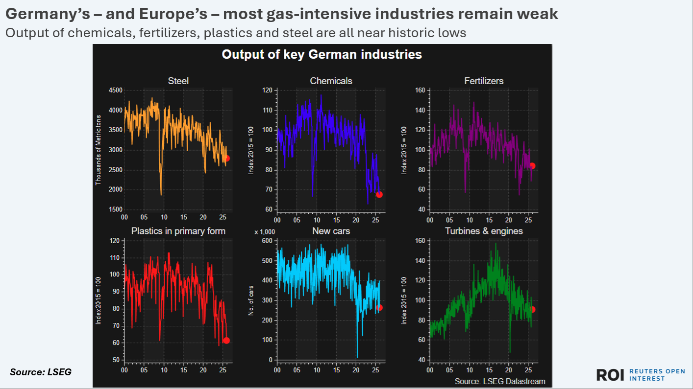 Europe's broader industrial economy, however, remains hobbled by weak manufacturing and consumer demand, and output among gas-intensive sectors such as chemicals and fertilizers remains near historic lows in top regional producer Germany.