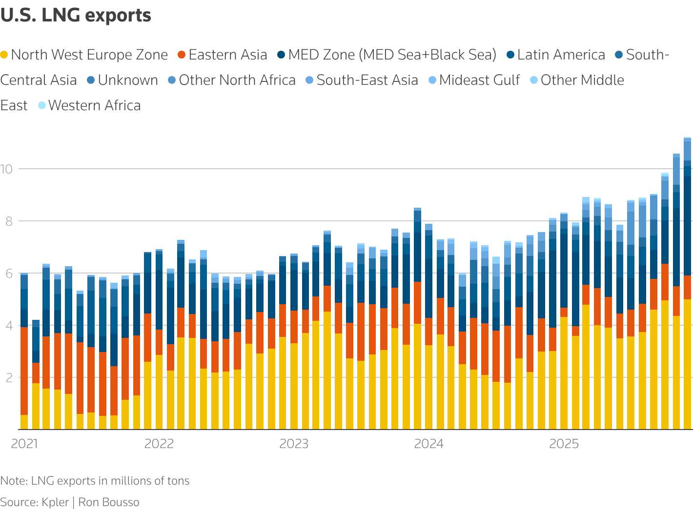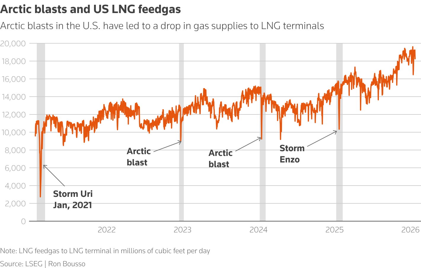 Global knock-on effect. What has changed in recent years is that cold weather conditions in the U.S. can now lead to higher gas prices in Asia and especially Europe, which is heavily dependent on U.S. LNG after Russia slashed pipeline flows following its invasion of Ukraine in 2022.