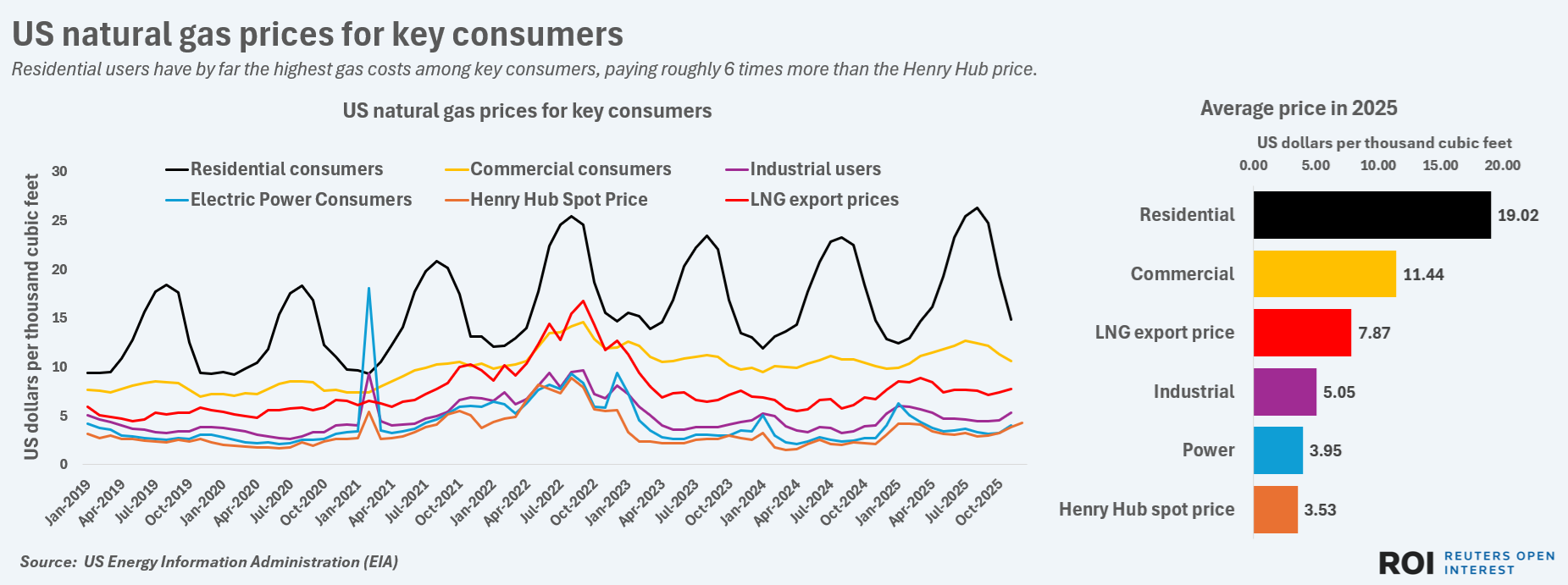 Residences already face the highest gas costs of all consumers, with prices averaging around $19 per MCF in 2025, EIA data shows.