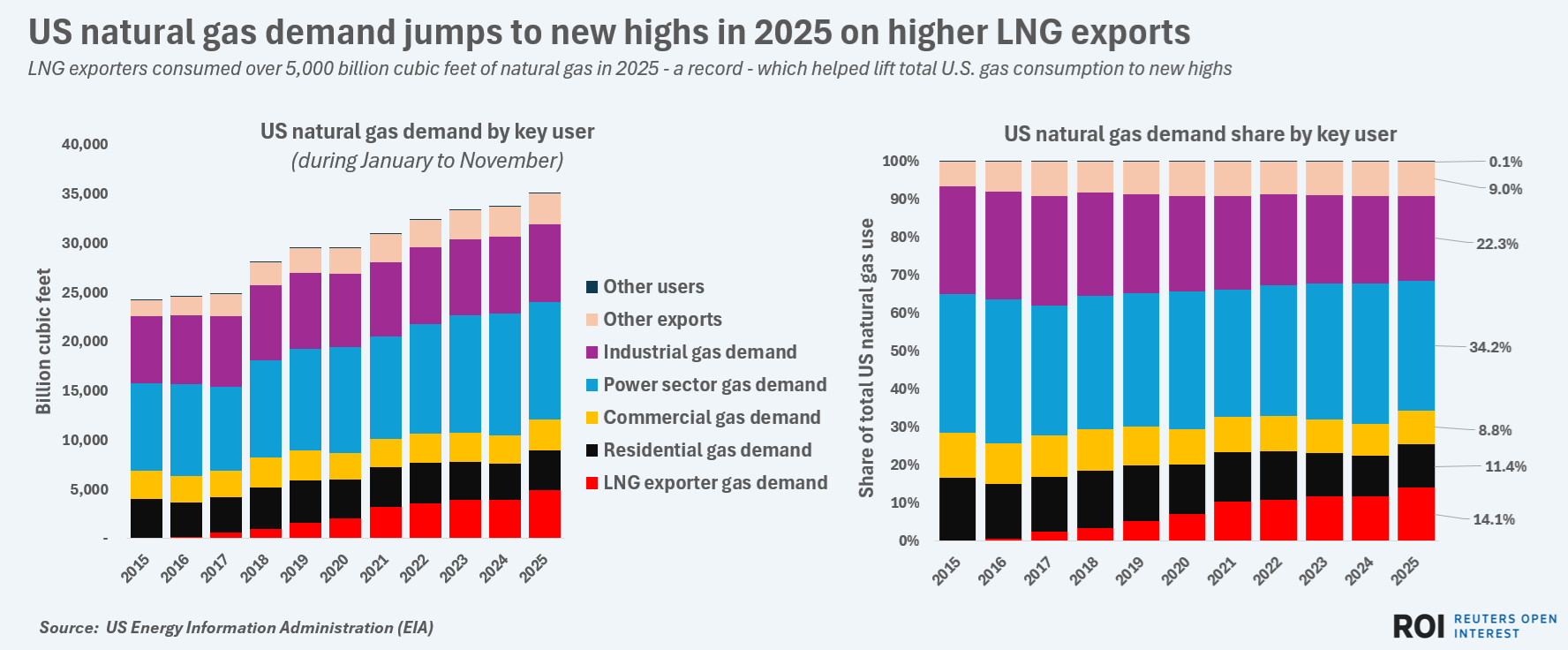 LNG exporters consumed > 5,000 Bft3 of natural gas in 2025 - a record - which helped lift total U.S. gas consumption to new highs.