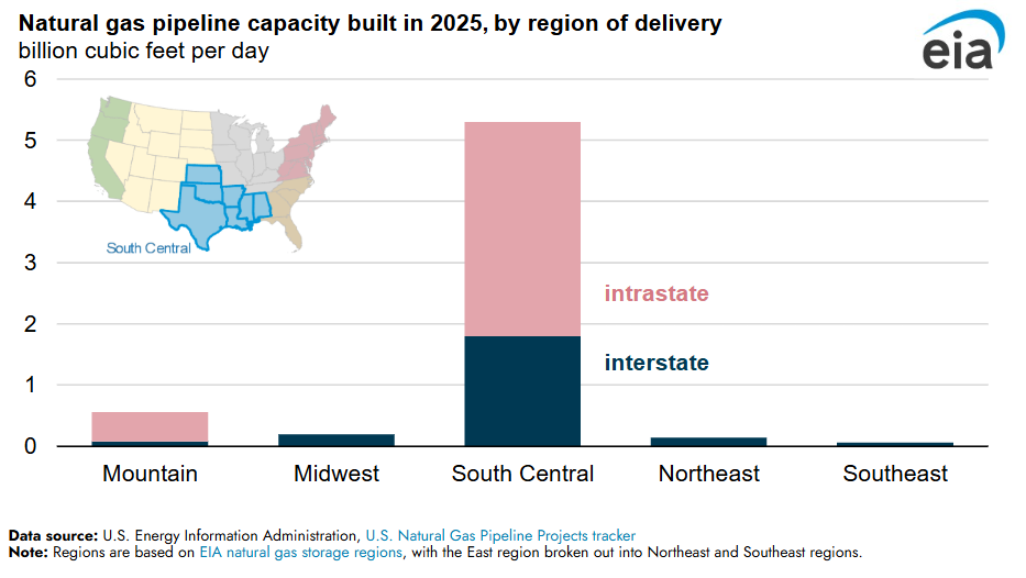 EIA: Most natural gas pipelines built in 2025 connect the South Central United States to supply