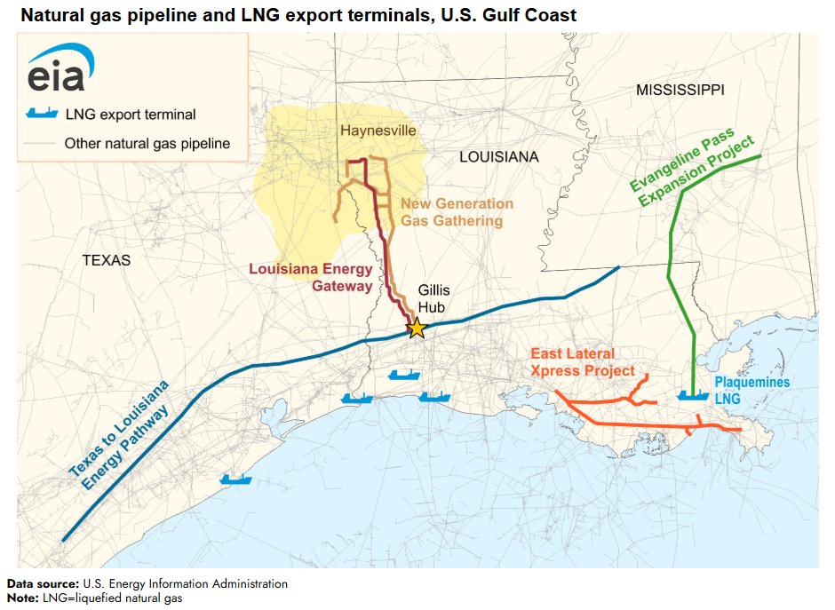 The new intrastate capacity built in 2025 largely functions as gathering systems, which are essential for transporting natural gas from producers into the wider transmission system. Two such projects completed in 2025 expanded pipeline capacity by a combined 3.5 Bft3d to connect natural gas production from the natural gas-producing Haynesville formation to the Gillis Hub in southeastern Louisiana. The Louisiana Energy Gateway project added 1.8 Bft3d, and the New Generation Gas Gathering system added 1.7 Bft3d. Both were in service as of October 2025.