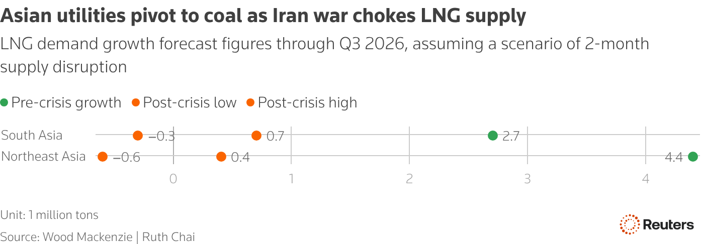 Asian utilities are boosting coal-fired power generation to cut costs and safeguard energy supply, industry officials say, as the U.S.-Israeli war on Iran chokes liquefied natural gas (LNG) shipments and soaring prices threaten to suppress LNG demand.