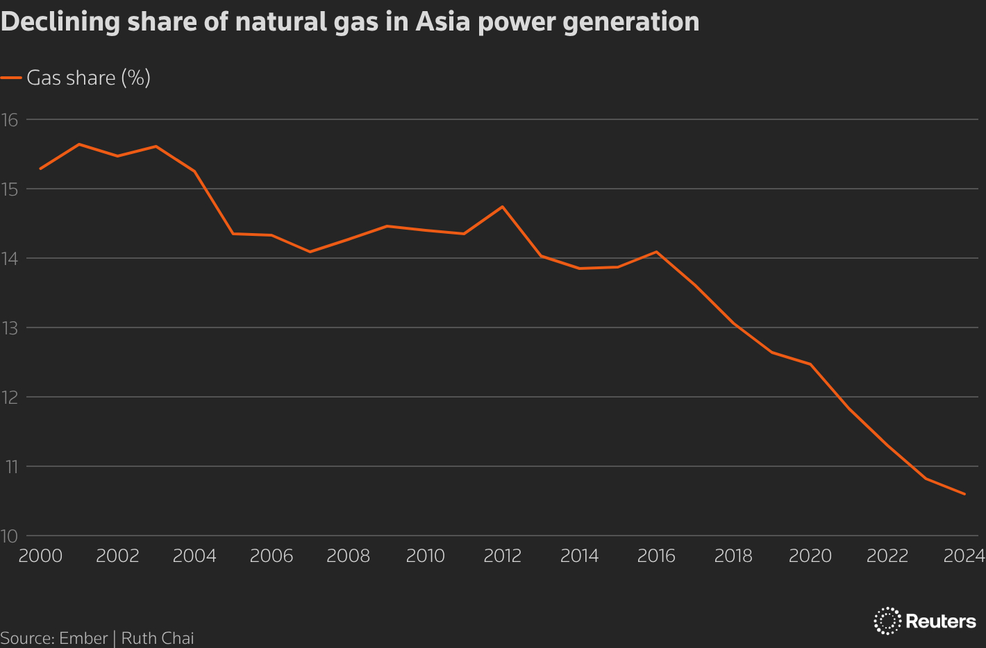 DECLINING SHARE OF NATURAL GAS IN ASIAN POWER GENERATION. Natural gas has accounted for a declining share of Asia's power generation for nearly a decade due to surging renewables usage, Ember data shows, despite global energy majors betting billions of dollars on regional LNG demand growth.