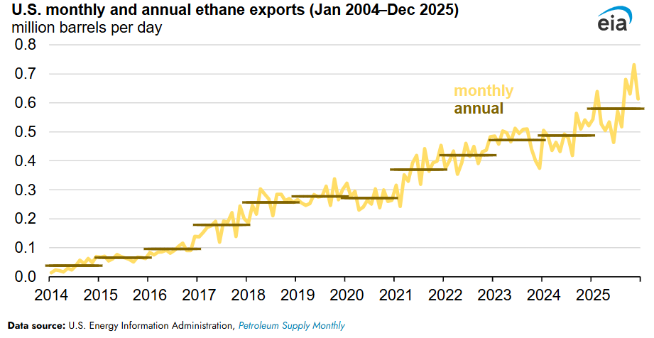 Ethane exports grew by 92,000 bpd (19%) in 2025, mostly from demand created by two newly completed projects: the Coatzacoalcos ethane cracker expansion project completed in May 2025 in Mexico and a new Yantai 2 ethane cracker in China completed around March 2025. Ethane is used primarily in petrochemical production of plastics by cracking ethane into ethylene, a base feedstock for petrochemicals. The United States is one of the only countries capable of exporting waterborne ethane, apart from Norway, which exports small amounts around Northwest Europe.