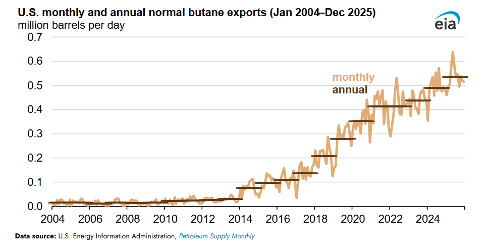 U.S. normal butane exports have increased every year since 2006, reaching a record-high average of nearly 535,000 bpd in 2025, a 9% increase from the previous year. Butane is used as a cooking fuel, a petrochemical feedstock, and a gasoline blendstock during the winter. Butane can also be converted to isobutane through isomerization, producing high-octane gasoline components. The United States exports a small amount of isobutane. Generally, butane demand has grown along with petrochemical demand. However, in many developing markets, governments have subsidized butane as a cleaner-burning replacement for other fuels (for example, wood or charcoal) for uses such as cooking or heating.